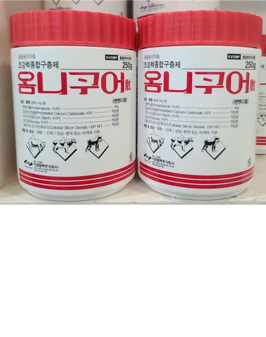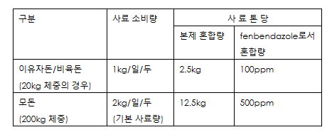 ②25일이상구충시사료톤당100g(4ppm)혼합투여 2)반추수: 1일체중kg당본제를125mg(fenbendazole 5mg) 1회경구투여한다. 3)말: 1일체중kg당본제를187.5mg(fenbendazole 7.5mg) 1회경구투여한다. 4)개,고양이: 1일체중kg당본제를1.25g(fenbendazole 50mg)을3일간경구투여하거나, 체중kg당2.5g(fenbendazole 100mg)을1회경구투여한다. 5)임신개: 1일체중kg당본제를1.25g(fenbendazole 50mg)다음과같이투여한다. -분만전45일에서50일까지또는분만전22일까지한번실시하고분만후12일에서18일까지재차투여한다. 구충시기: -모돈구충:분만전1차구충,이유직후2차구충 -이유자돈구충: 8주령에1차구충 포장단위 12.5g, 25g, 250g, 10kg, 20kg 저장방법 및 유효기간 1)실온에서보관할것. 2)유효기간:제조일로부터60개월 주의사항 1)휴약기간:돼지- 0일,소- 8일 2)부작용:없음 3)금기사항: Bromsalane제제와동시에투여하지말것. 4)사용방법상의주의사항 (1)본제품은동물용의약품이므로수의사의지시에따라사용하십시오. (2)구충을위한별도의사료는필요하지않으며,투여전후절식시킬필요가없습니다. (3)병축및임신기간중에투여해도안전합니다. (4)정해진용법ㆍ용량을준수하며,지정된축종에만사용하십시오, (5)어린이의손에닿지않는건조하고서늘한곳에보관하십시오. (6)유효기간이경과한제품은사용하지마시고만약구입시유효기간이경과되었거나변질ㆍ변패또는오손된제품일