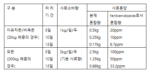 *사료소비량에따라증감될수있음. (2)장기집단구충(5 - 15일간구충) ①5 - 15일간먹을수있는사료에구충용량(체중kg당fenbendazole 5mg)을혼합하여다음과같이투여한다.