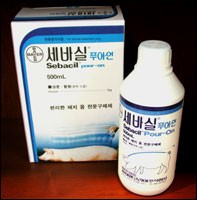 등줄기에 부어 사용할 수 있도록 개발된 돼지 옴 전문 구제제제로서 개의 개선충에도 임의적으로 사용되기도 함 성분 및 함량 본제 1L중Phoxim 75g효능돼지옴, 이의 예방 및 구제