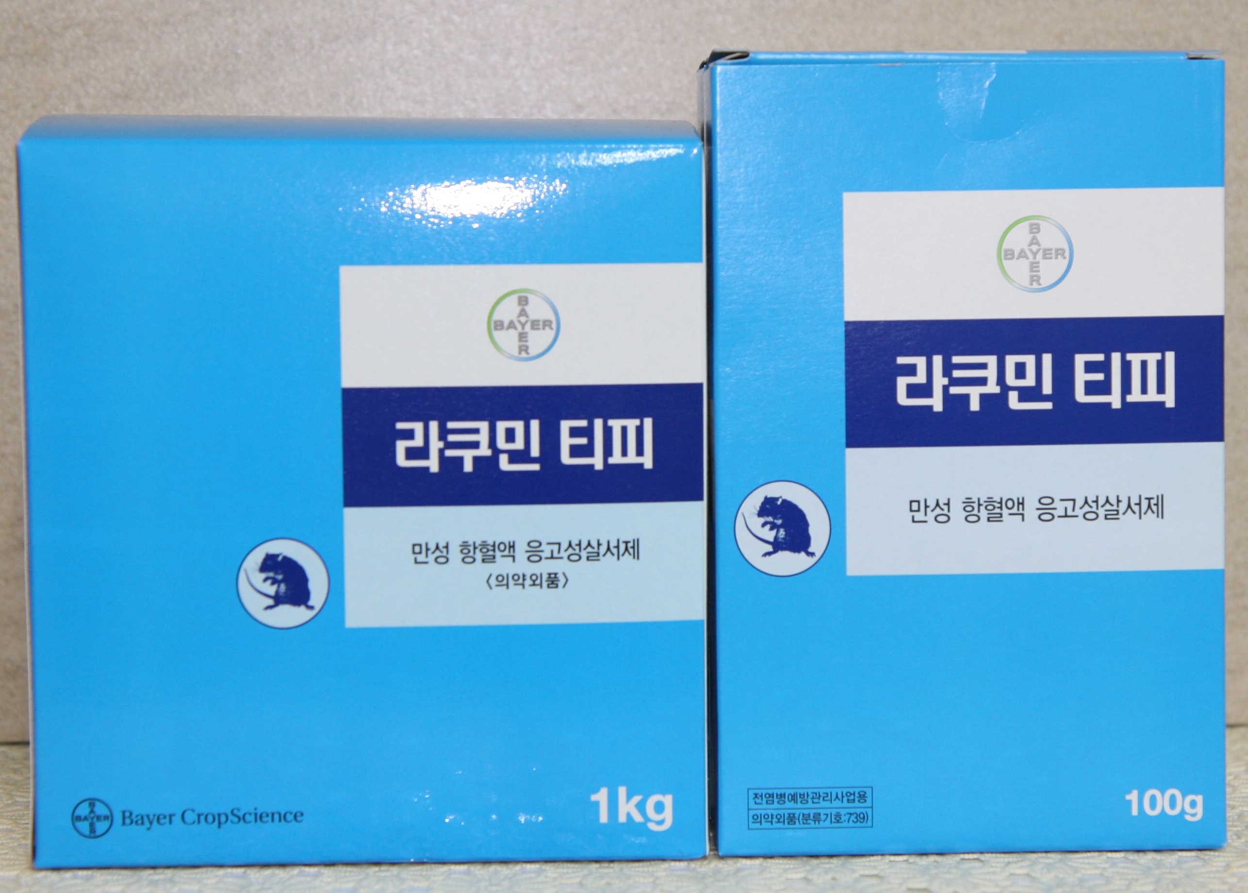 적용방법 및 비율 - 본제 50g을 쥐가 선호하는 곡물 및 기타 음식물 950g에 배합하여 준비한 독 먹이를 20-30g 되게 ‘독극물’이라는 표시가 되어있는 용기에 담아, 옥외(집주변 또는 지붕위)에 5-10m 간격으로 하여 쥐가 잘 다니는 곳이나 쥐의 서식처 근처에 설치한다.