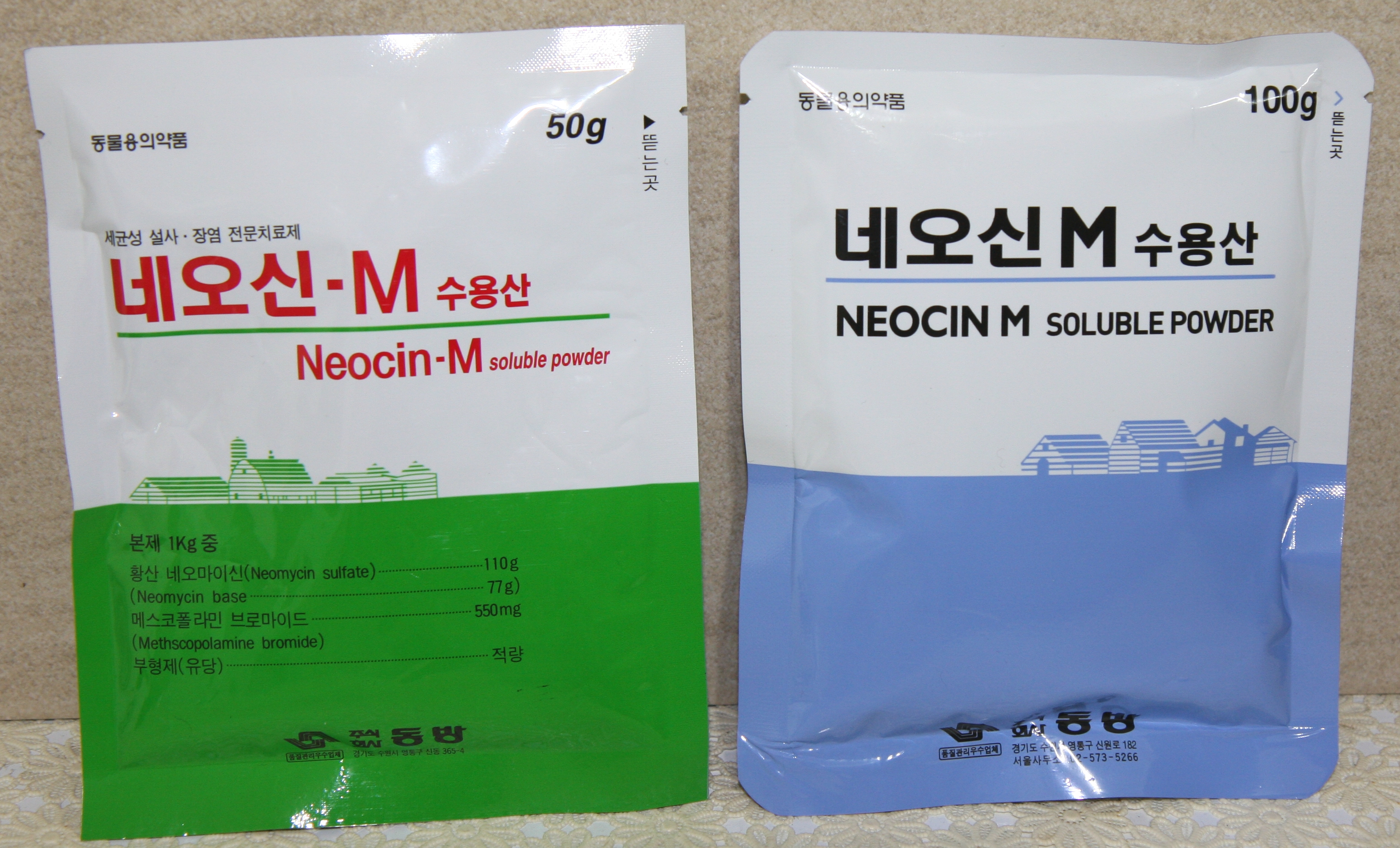 성분 및 분량 본제 1kg중 Neomycin sulfate ----------------------- 110.000gm Methscopolamine ----------------------- 550.000mg