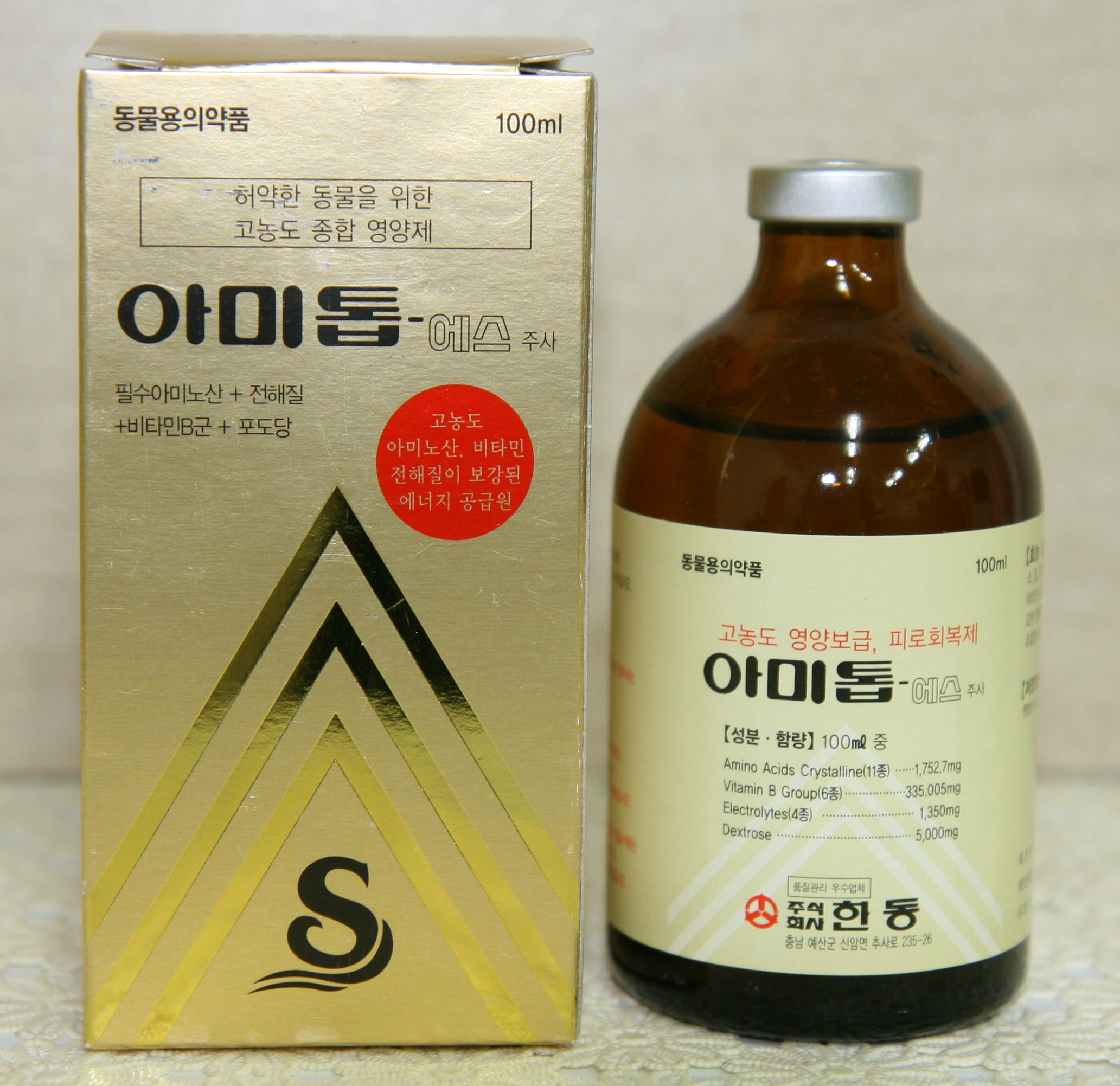 효능.효과 쇠약한 동물에게 당분 및 비타민(비타민B그룹)과 다용도성 아미노산의 보급, 대사에 필요한 전해질의 보급과 영양보급 *소, 말, 양, 돼지, 개의 체중 5kg당 1ml식 1일 1~3회 피하.근육 또는 정맥주사