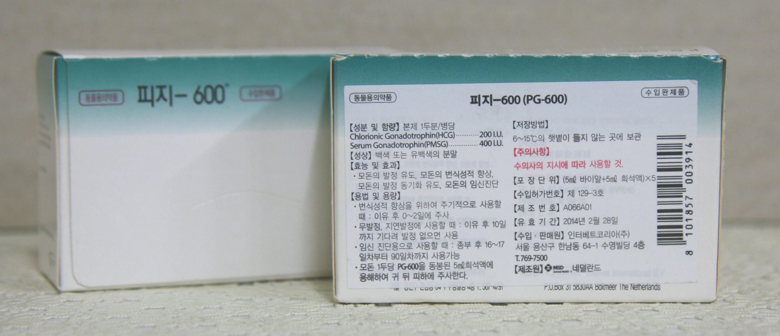 용법 -임신잔단용으로 사용할 때 : 종부 후 16-17일차부터 90일차까지 사용 가능 -모돈 1두당 PG-600을 동봉된 5ml 희석액에 용해하여 귀뒤 피하에 주사한다. |
