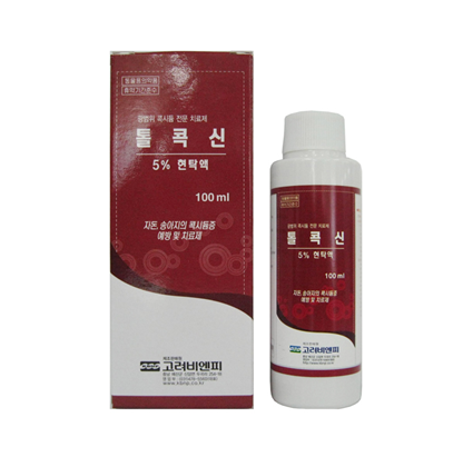 | 구분 - 항균제 제형 - 항콕시듐제 포장 100ml 성분/함량 제품 1L 중 - 톨트라주릴(Toltrazuril) .................. 50g 특장점/효능 - 콕시듐의 감염에 의한 자돈의 설사 예방 및 치료 용법/용량 - 3~7일령의 자돈에 본제 1ml를 1회 경구투여 |