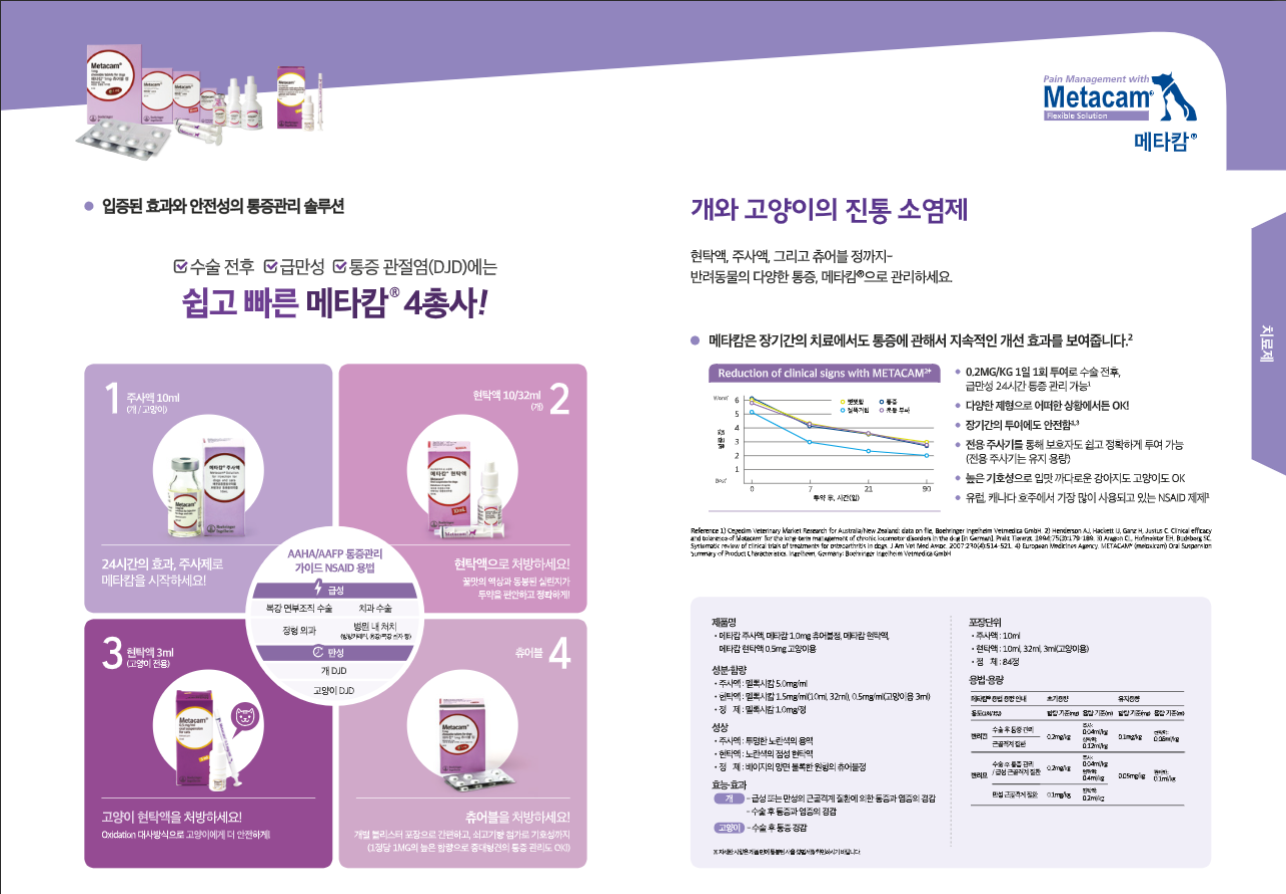 효능 및 효과 - 대상동물 : 애완용 개 - 급성과 만성의 근골격계 질환에 의한 통증경감과 염증의 치료