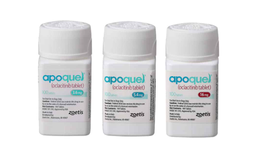 효능 및 효과 개의 알러지성 피부염을 동반한 소양성 피부염의 치료 개의 아토피성 피부염의 임상적 증상의 치료 용법 및 용량 최초 투여 역가: 체중 kg 당 oclacitinib 0.4-0.6 mg, 14일까지 1일 2회 경구 투여 유지 용량: 동일한 용량으로 1일 1회 경구 투어 개의 체중(kg) 투약 정제의 개수 (1회 투여시)