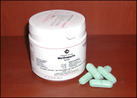 성분 및 함량 본제 1정중Sulfamethazine 37.5 g Neomycine 175 mg Vitamin A 10,000 IU Pyrilamine maleate 10 mg Methy atropine nitrate 1 mg Sodium Ascobarte 12.5 mg Electrolytes and Artificially Colored Base qs